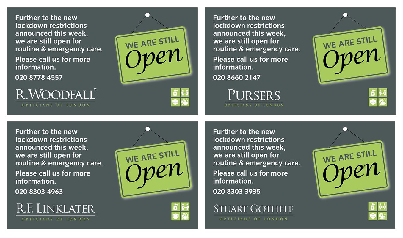 During the Covid lockdown, opticians were still open and providing essential services. I produced these images for use on all social media channels and for all 6 Woodfall branches to promote and inform their clients that they were still open.
