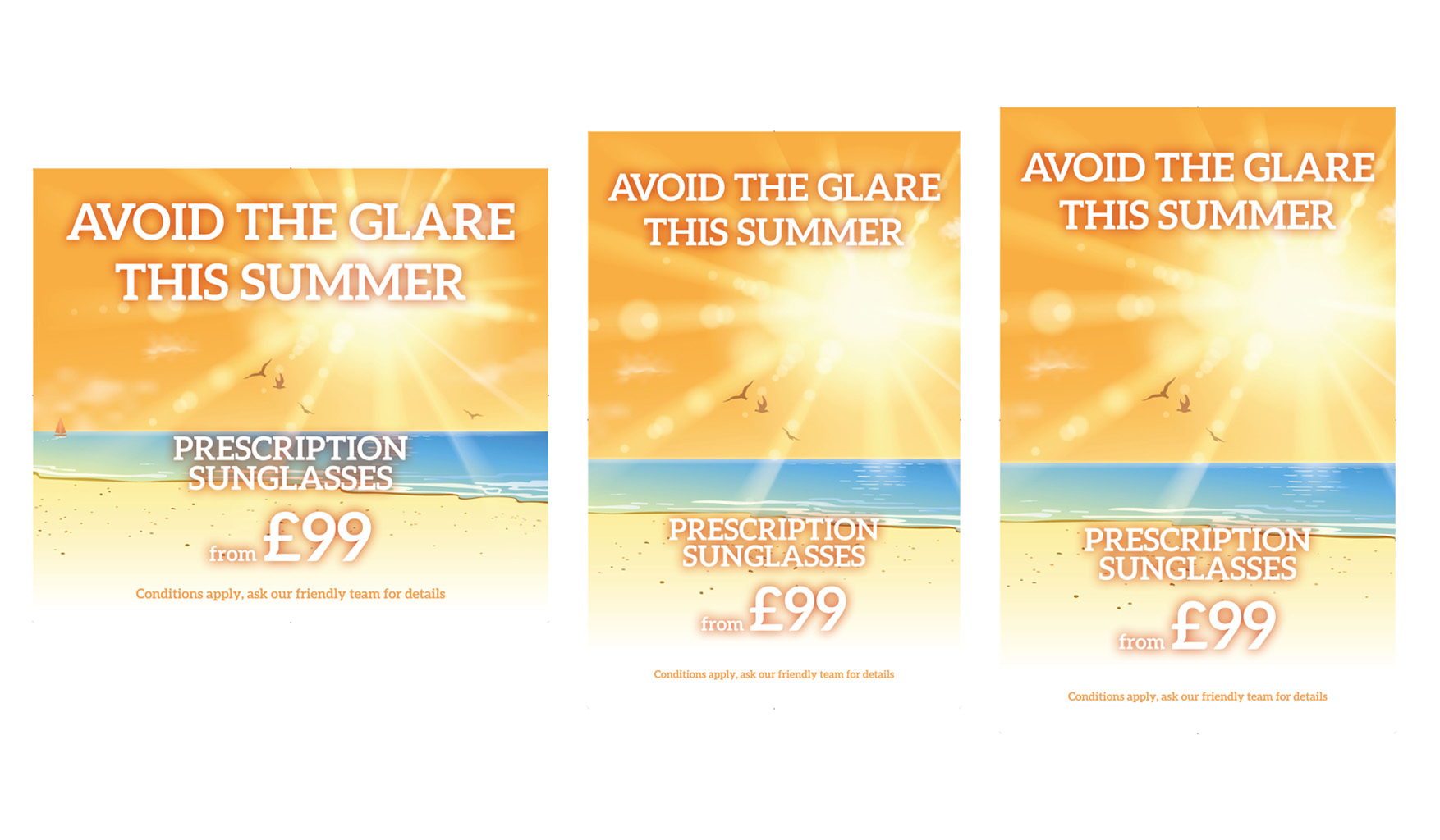 Design, artwork and produce print-ready files for Large Format Window Clings. The client is an Opticians with 6 branches in South East London. Each branch needed a different specification for the window cling, so on approval of the basic design concept six different versions were produced.
